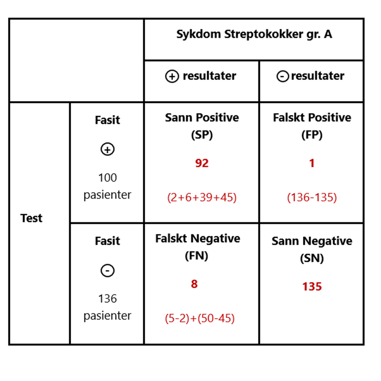 Fra tabellen kan man regne ut andelen i prosent med riktige positive og riktige negative svar, som tilsvarer sensitivitet og spesifisitet som produsenten oppgir.