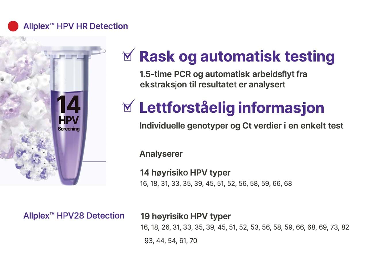 - Presis genotyping – Simultan identifisering av opptil 28 varianter fra samme prøve, hvorav 19 er høyrisiko (inkludert HPV16 og HPV18) og 9 er lavrisiko, med individuelle Ct-verdier.