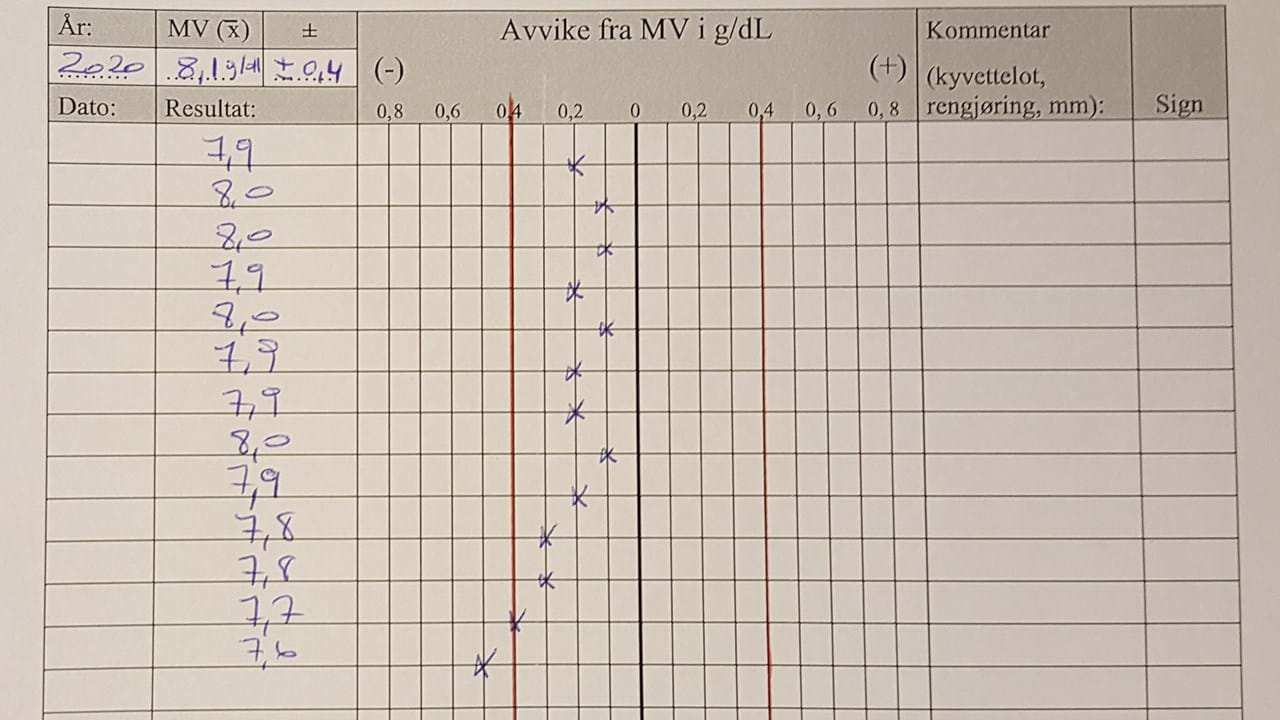 - Sjekk at både kontrollmateriale og kyvettene er innenfor utløpsdatoen. Pass på at makstid etter åpning for kontrollene: 31 dager. Har du glemt å notere når kontrollen ble åpnet, åpne opp en ny flaske og analyser på nytt.