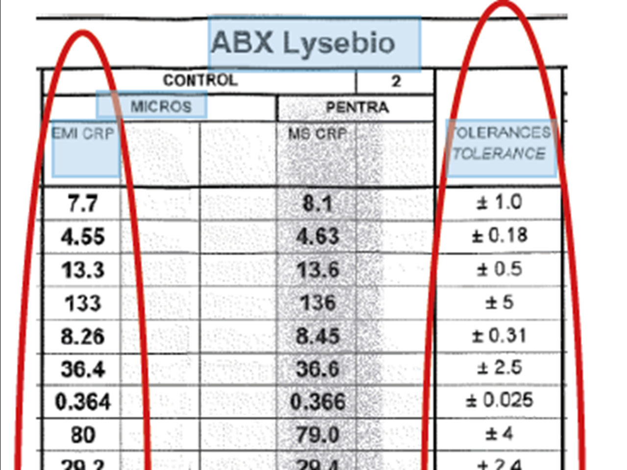 Triolab anbefaler at fasitverdiene for kontrollene legges inn i instrumentets software, slik at instrumentet varsler avvik automatisk. Husk at det er nye fasitverdier for hver leveranse av kontroller.  Se i Microsemi CRP Kortfattet manual - kap. 6 - for å legge inn nye fasitverdier ved ny kontroll-lot.